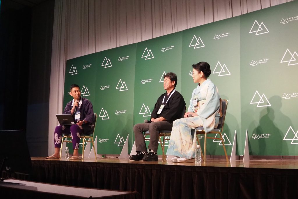 オープニングセッションは、京都の老舗和菓子店「京菓匠 笹屋伊織」十代目女将の田丸さんと、茶筅師として、伝統文化を受け継がれている和北堂 谷村さんをお呼びし、三井住友カードの神谷さんにモデレーターを務めていただきました。(神谷さん、御神輿を担ぐのが大好きとのことで、なんと自前の法被でご登壇いただきました!)