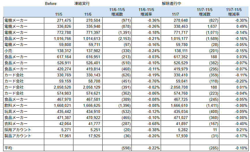 11/7(金)には凍結解除がトレンドインしており、11/7 11時ごろには凍結数の平均の約47%が戻っていました。