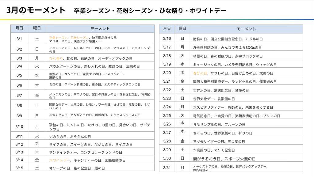 3月は「卒業シーズン」「花粉シーズン」「ホワイトデー」など、生活者の関心が高まるモーメントが複数あります。