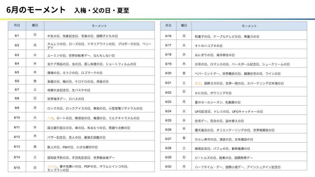 今回は、SNS投稿のヒントとして活用いただける「6月のモーメントカレンダー」をご紹介します。
