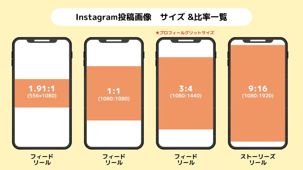 Instagramではさまざまな比率の画像や動画を投稿できますが、プロフィールグリッドに表示されるのは中心の3:4部分のみです。