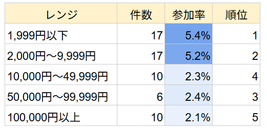 景品の価値(金額)が安いほど参加率が高いです。ただ、1個当たり金額が安いほど当選人数が多い傾向にあり、この結果だけでは判断はできません。10,000円以上は参加率はほとんど変わらない結果です。
