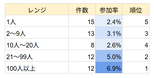 当選人数が多い方が参加率が高く、前ページの「景品の単価」よりも参加者数を増やすための影響度が高そうです。1~20人までは差は小さく、21人以上の参加率との差が大きいです。