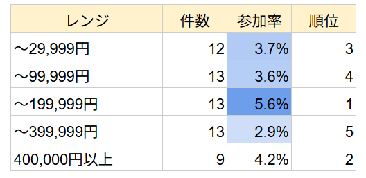 当選者の一人あたり景品金額(想定市場価格)により参加率の差を調べました。
