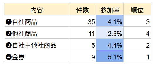 誰もが好きなものが買える金券の参加率が高いですが劇的な差ではありません。続いて自社商品です。他社商品を景品にするケースは、自社との繋がりやそれが景品の理由などストーリー性で補う必要がありそうです。