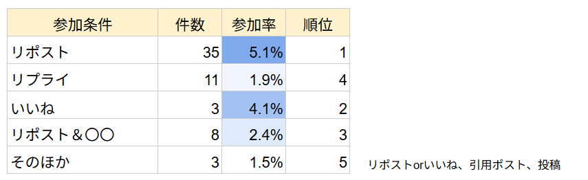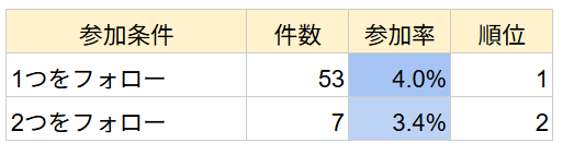 フォロー&〇〇が一般的な参加条件で、〇〇の部分を下記53パターンで参加率を比較しました。