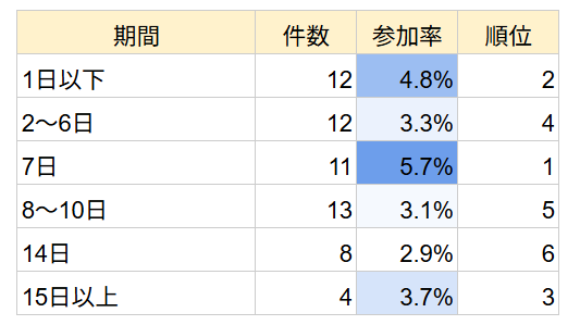 基本的には「見たタイミングで参加」することが多いと考えますが、一定の期間があることでリマインドを効かせることができ、特に7日間は平日、土日などアクティブ利用者が異なる曜日を含めることで高いと考えます。一方で強いモーメントに絡めたり、「今日」を強く伝えたい情報は1日限定も高い参加率を作っています。