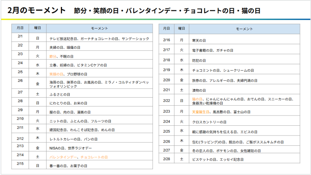 今回はSNS投稿のヒントになる2月のモーメントカレンダーをご紹介します!!