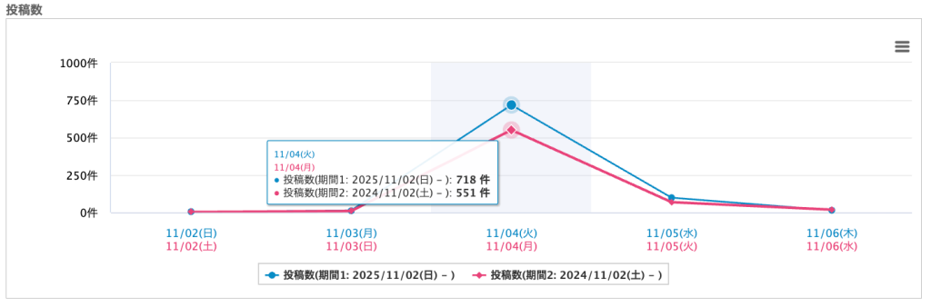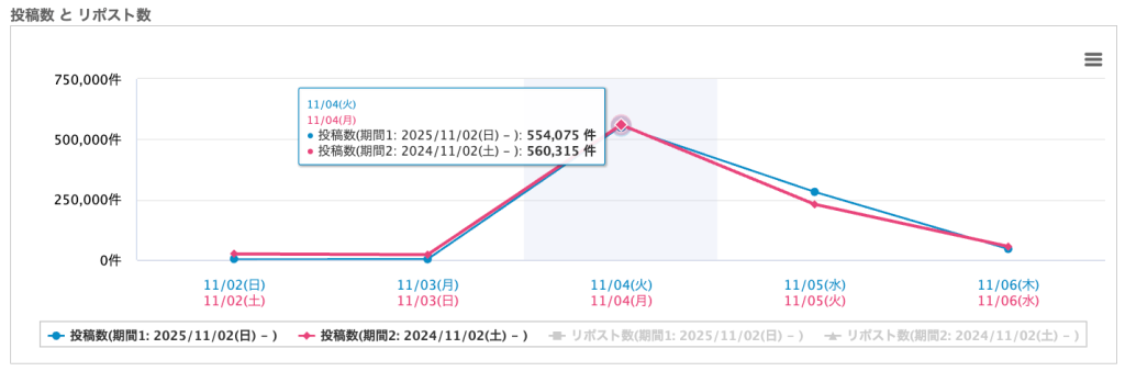 青線が2025年、赤線が2024年の発話数。リポスト数を含んだ数値です。